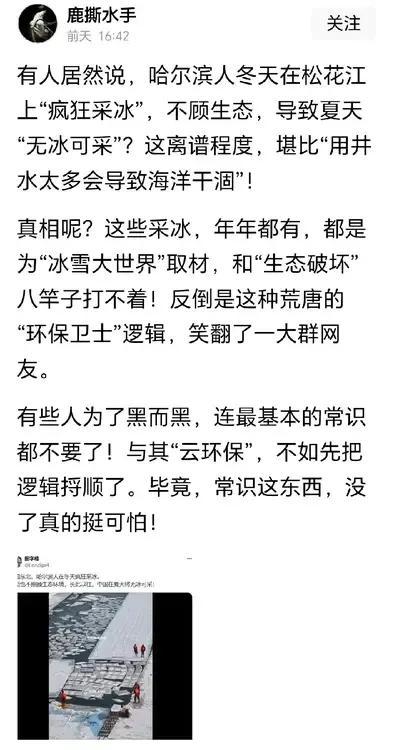 【松花江夏天确实无冰可采了,是因为哈尔滨冬天“疯狂采冰”吗】不管是不是因为“哈尔滨人冬天在松花江上‘疯狂采冰’,不顾生态,导致夏天‘无冰可采’?”我作为四川去的游客,我作证,我今年夏天在哈尔滨游玩的20多天中,从哈尔滨松花江上的阳明滩大桥,往东到整个太阳岛的冰雪大世界南北,再到东面的阿勒锦岛四周,确实没有看到夏天的松花江上有冰存在。这至少说明,松花江的夏天的确无冰可采了。这个“有人”说的一点没错!可笑吗?为黑而黑,不可笑!