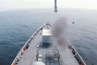 这三发导弹由于速度太快,并且有烟雾阻挡,但仍能分辨出应该是一枚冷发射的海红旗9防空导弹和两枚热发射的鹰击18反舰导弹。